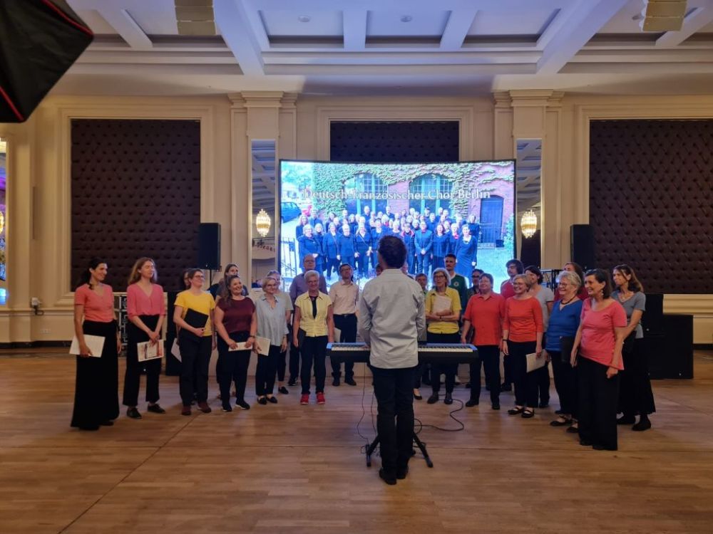 Am 12.7. hatte der DFC Berlin die Ehre, bei der Feier zum Nationalfeiertag Frankreichs die französische und die deutsche Nationalhymne sowie die Europahymne (Ode an die Freude) zu singen. Uns und den zahlreichen Gästen, die freudig mit einstimmten, bereitete dies gleichermaßen Freude. Ein wunderbarer Abschluss, bevor sich alle in die Sommerpause verabschiedeten.
